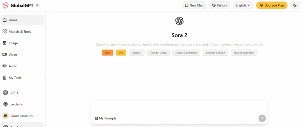 If you don’t have an invite code, don’t worry—I’ve tested a verified way to access Sora 2. The third-party platform Global GPT has already integrated Sora 2, and you can use it freely without any verification.