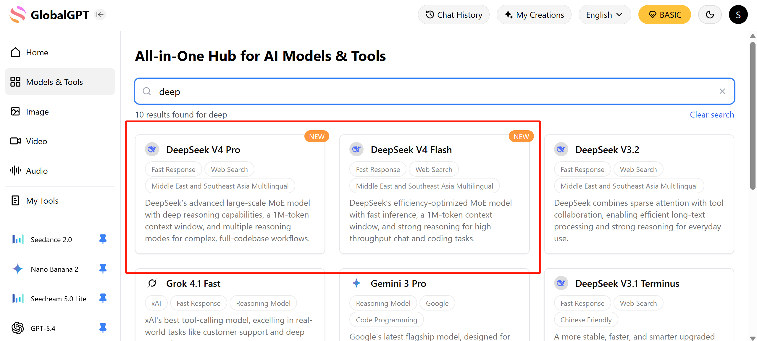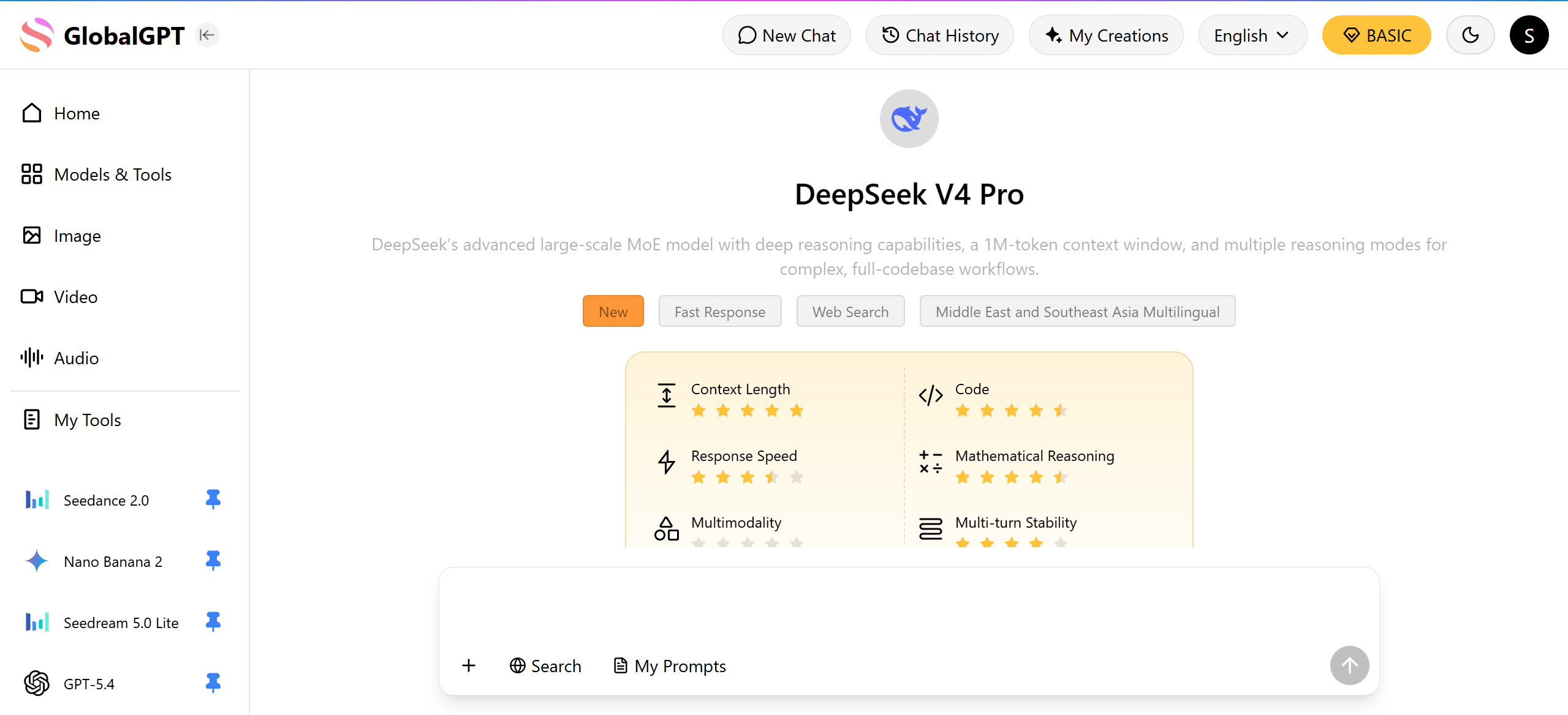 To solve these frustrations, GlobalGPT has fully integrated the DeepSeek V4 family into its streamlined dashboard, offering a stable, high-speed environment for immediate deployment. You can now access the flagship DeepSeek V4-Pro for deep reasoning, the ultra-fast V4-Flash for real-time logic, and the V4-Vision native multimodal model without worrying about regional IP blocks or complex API key management. For power users focused on large language models, the Basic Plan at only $5.8 provides an unbeatable entry point, while creative pros can unlock the full potential of V4-Pro through our $10.8 Pro Plan, which includes advanced video and image capabilities.