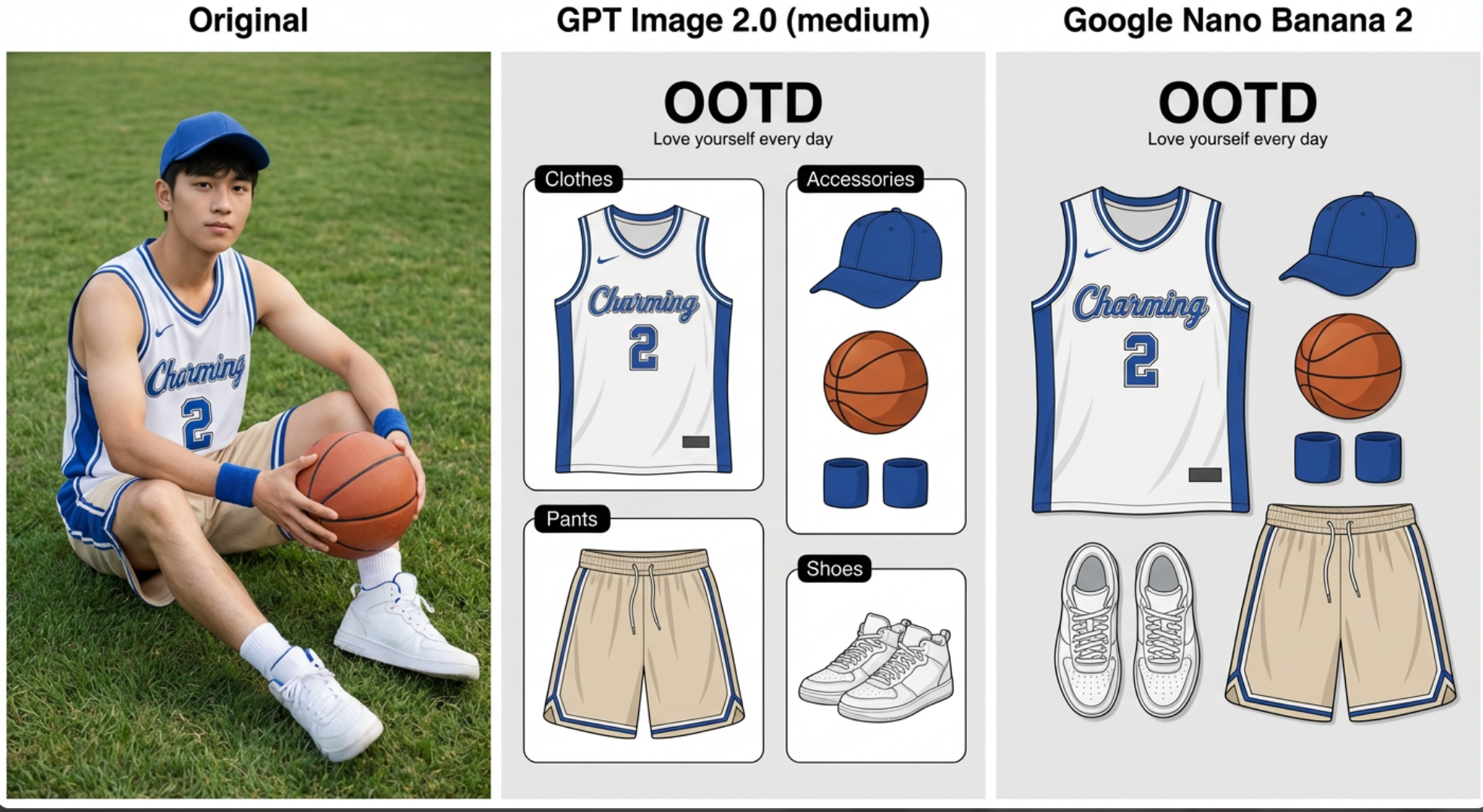 Round 3: The "OOTD" Poster Test: When asked to create a minimalist Japanese poster with the handwritten text "OOTD" and a sub-title, GPT Image 2 achieved 100% accuracy. Nano Banana 2 created a beautiful photo, but it failed to follow the design logic and made typos in the sub-title.