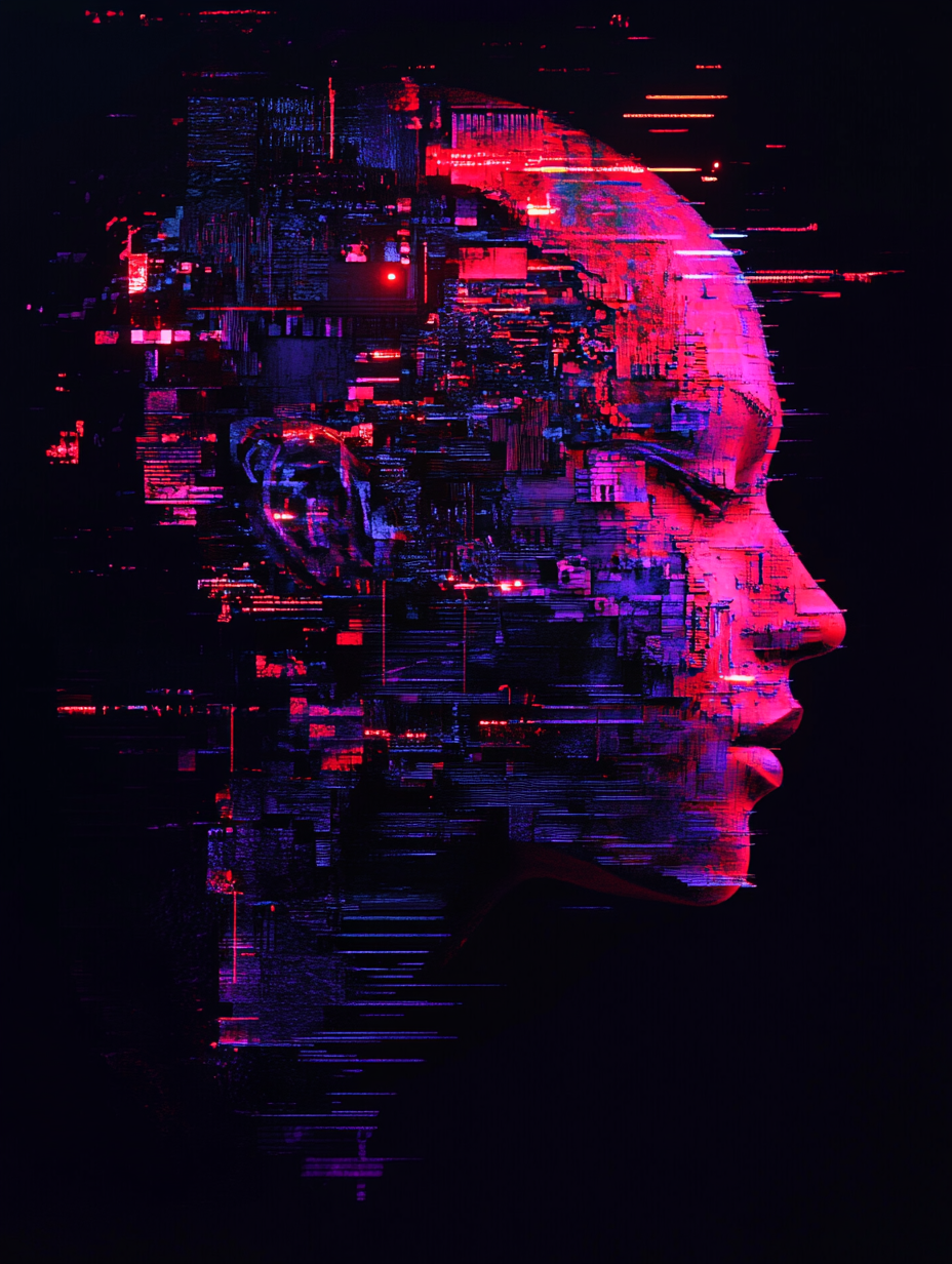create a cyberpunk-inspired digital artwork featuring a human head in profile. The head integrates futuristic, cybernetic elements with a fragmented, glitched appearance, accented by neon red and purple hues. The overall atmosphere is dark and dystopian, evoking a sense of high-tech menace and futuristic decay.